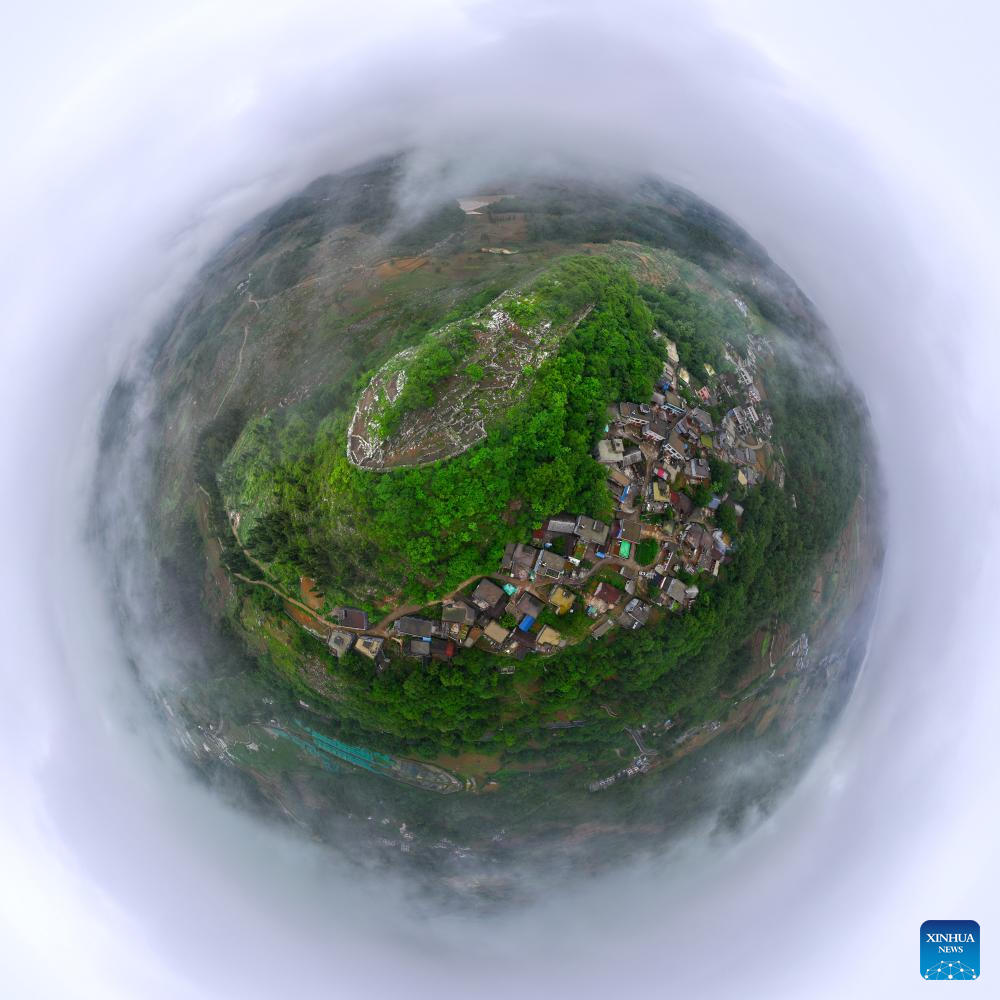 An aerial panoramic drone photo taken on May 17, 2024 shows a view of an ancient city ruins dating back to the Ming Dynasty (1368-1644) at Pingzhai Village of Bouyei-Miao Autonomous Prefecture of Qianxinan, southwest China's Guizhou Province. The site appears oval-shaped when viewed from above, covering an area of about 18,000 square meters, with more than 900 meters of stone walls remained. (Xinhua/Liu Xu)