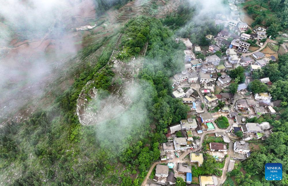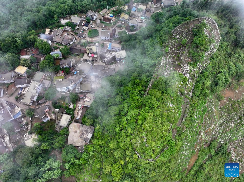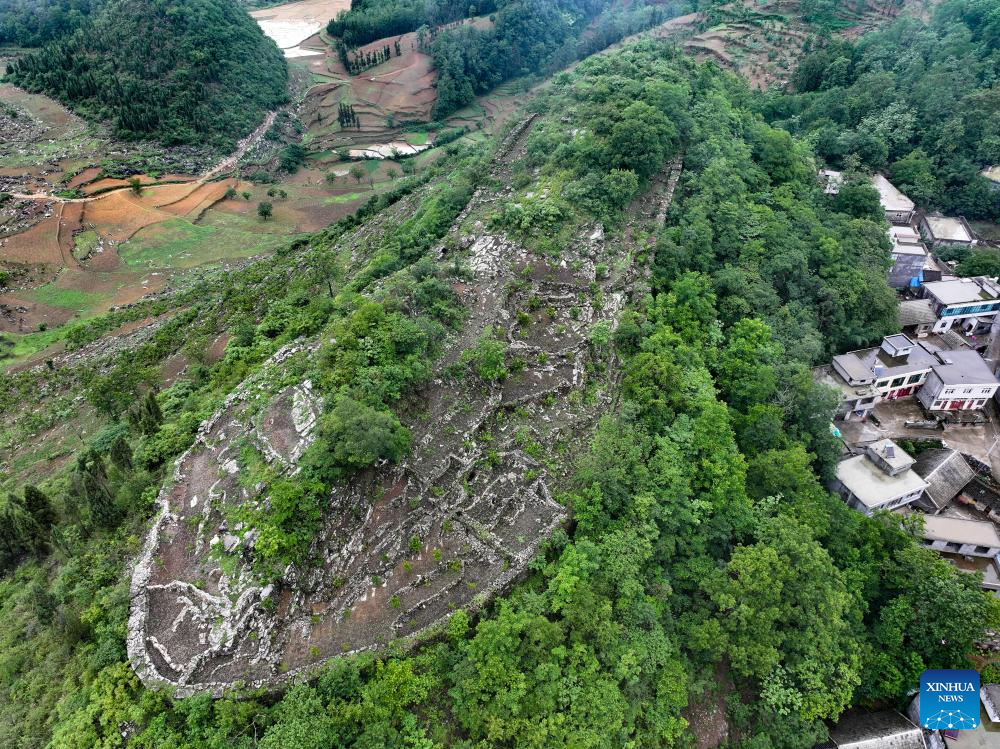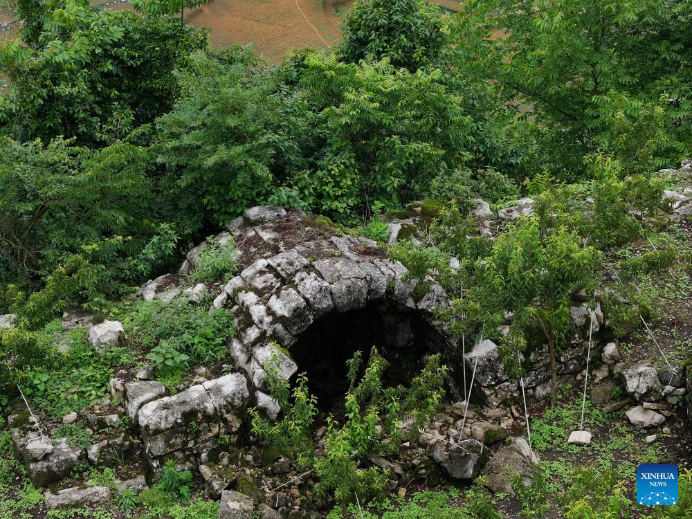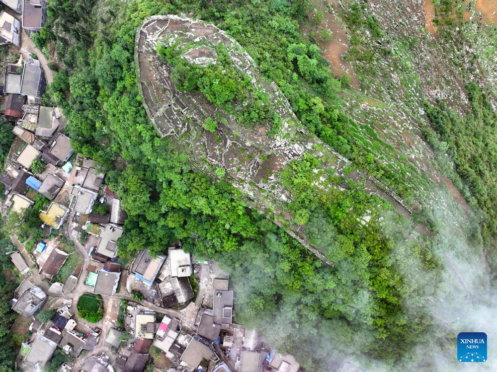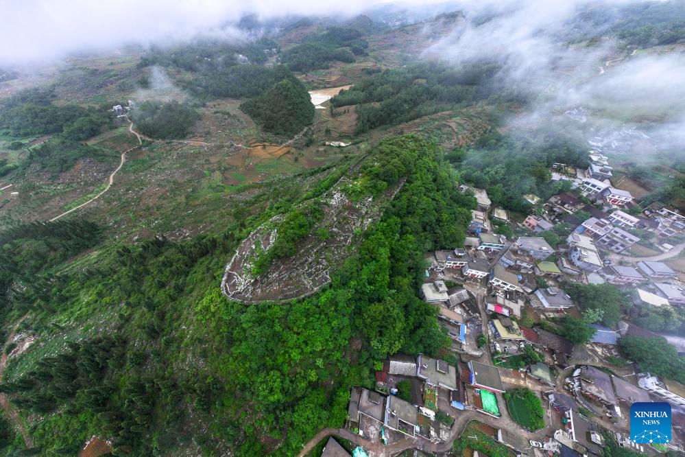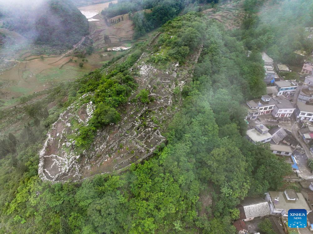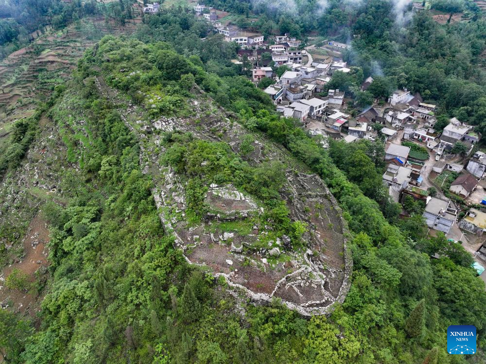 An aerial drone photo taken on May 17, 2024 shows a view of an ancient city ruins dating back to the Ming Dynasty (1368-1644) at Pingzhai Village of Bouyei-Miao Autonomous Prefecture of Qianxinan, southwest China's Guizhou Province. The site appears oval-shaped when viewed from above, covering an area of about 18,000 square meters, with more than 900 meters of stone walls remained. (Xinhua/Liu Xu)