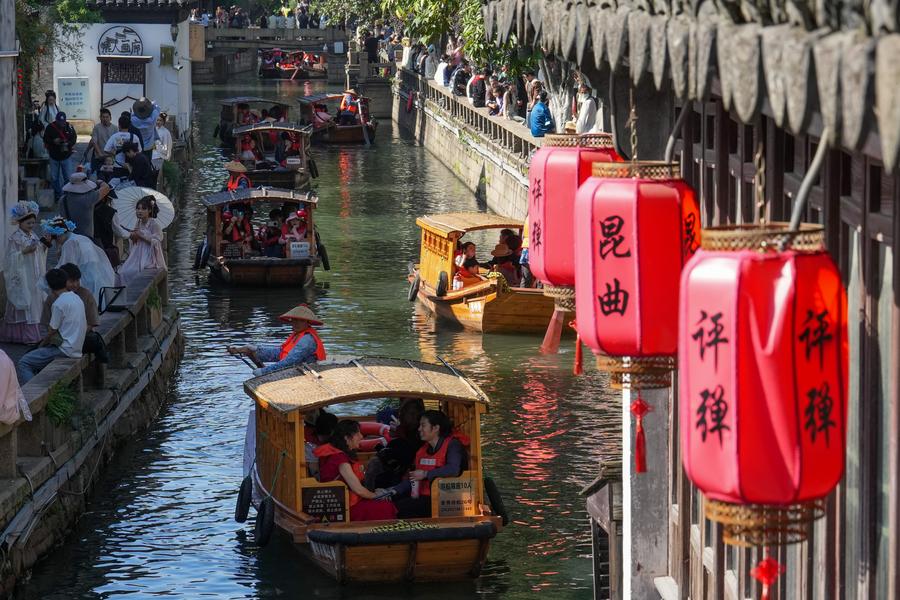 Tourists visit Pingjiang Road historical and cultural block in the city of Suzhou, east China's Jiangsu Province, April 18, 2024. (Xinhua/Li Bo)