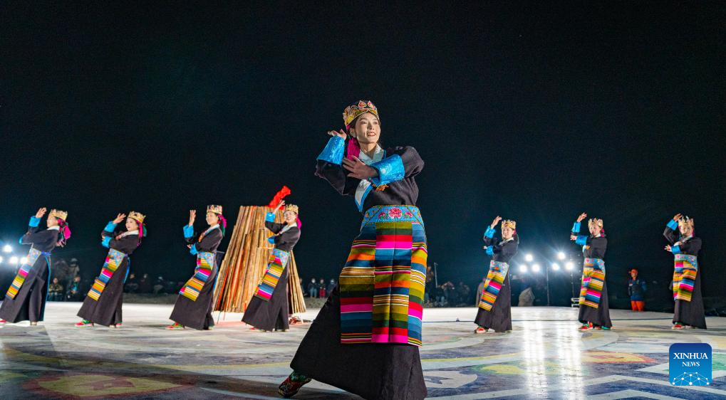 Performers dance at a bonfire party celebrating the melting of frozen water of Lake Namtso in southwest China's Xizang Autonomous Region, May 18, 2024. As temperature rises and ice melts, the Lake Namtso will enter its tourism season. (Xinhua/Tenzin Nyida)