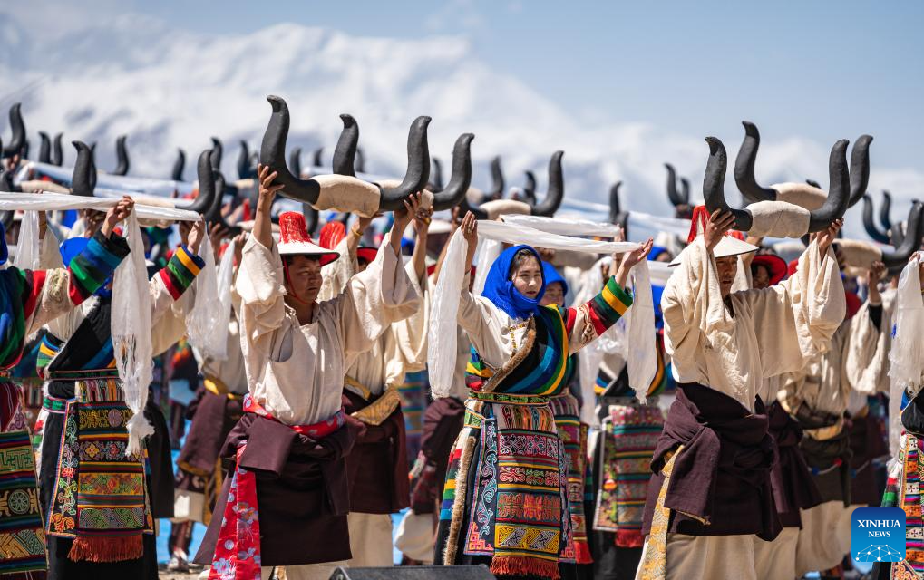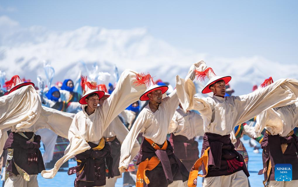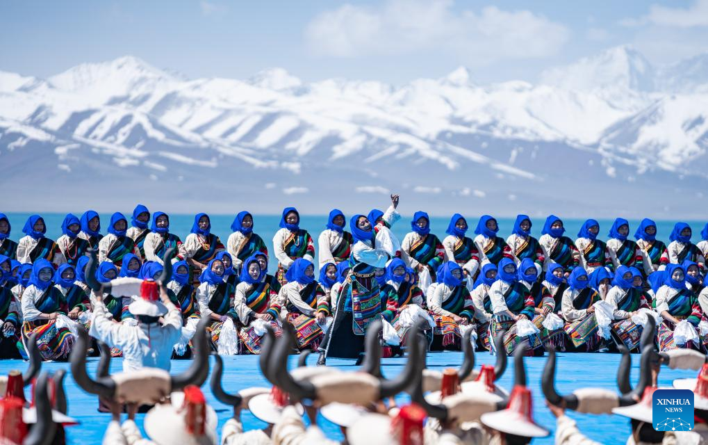 Performers dance at an event celebrating the melting of frozen water of Lake Namtso in southwest China's Xizang Autonomous Region, May 19, 2024. As temperature rises and ice melts, the Lake Namtso will enter its tourism season. (Xinhua/Tenzin Nyida)