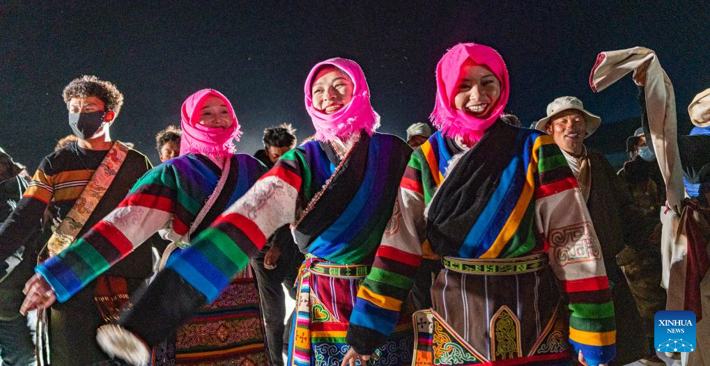 Locals dance at a bonfire party celebrating the melting of frozen water of Lake Namtso in southwest China's Xizang Autonomous Region, May 18, 2024. As temperature rises and ice melts, the Lake Namtso will enter its tourism season. (Xinhua/Tenzin Nyida)