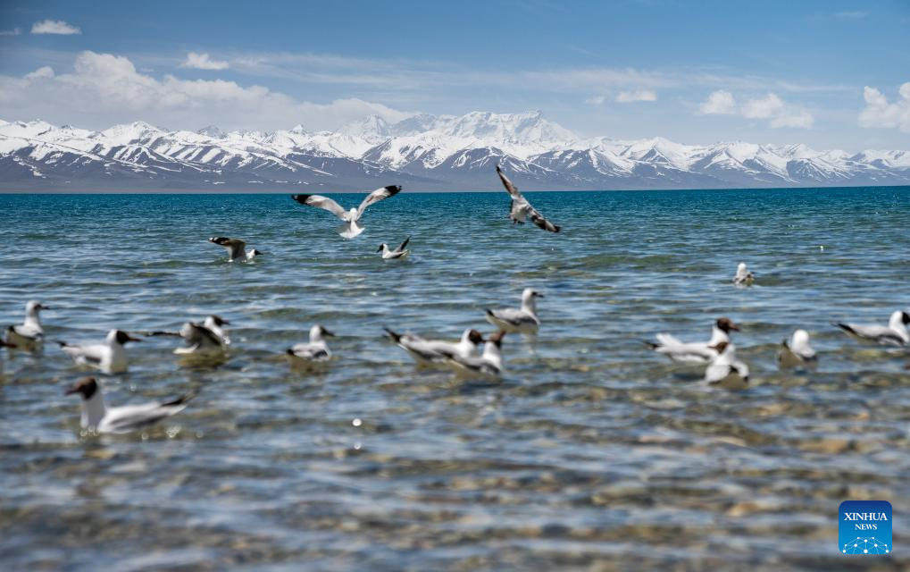 Brown-headed gulls are pictured at the Lake Namtso in southwest China's Xizang Autonomous Region, May 19, 2024. As temperature rises and ice melts, the Lake Namtso will enter its tourism season. (Xinhua/Tenzin Nyida)
