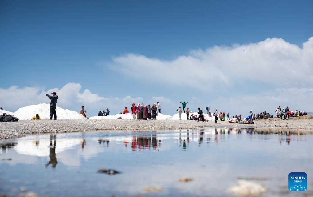 Tourists enjoy the scenery by the Lake Namtso in southwest China's Xizang Autonomous Region, May 19, 2024. As temperature rises and ice melts, the Lake Namtso will enter its tourism season. (Xinhua/Tenzin Nyida)