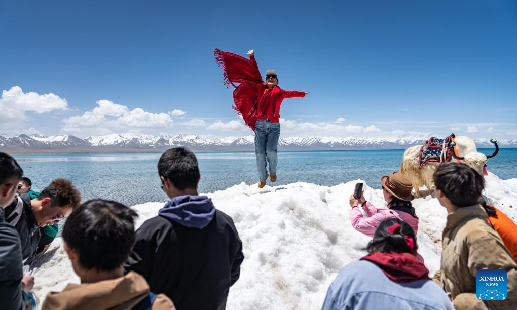 A tourist poses for photos by the Lake Namtso in southwest China's Xizang Autonomous Region, May 19, 2024. As temperature rises and ice melts, the Lake Namtso will enter its tourism season. (Xinhua/Tenzin Nyida)