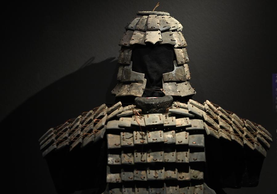 A suit of stone armor is displayed at the Qin Han Museum of the Shaanxi History Museum in Xi'an, capital of northwest China's Shaanxi Province, May 6, 2024. (Xinhua/Li Yibo)