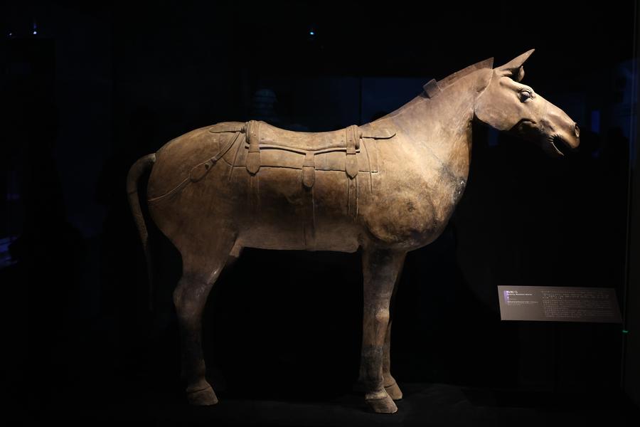 A pottery horse is displayed at the Qin Han Museum of the Shaanxi History Museum in Xi'an, capital of northwest China's Shaanxi Province, April 15, 2024. (Xinhua/Li Yibo)