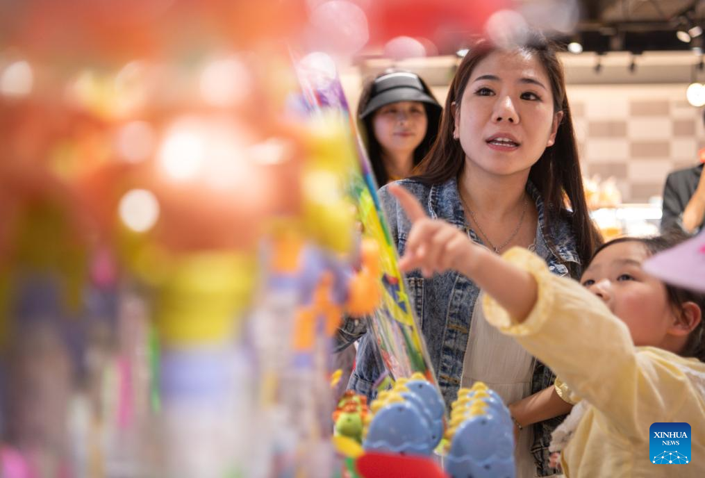 Li Hongjia and hearing-impaired children visit a supermarket in Jiangxia District of Wuhan, central China's Hubei Province, April 20, 2024. (Xinhua/Du Zixuan)