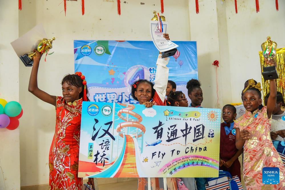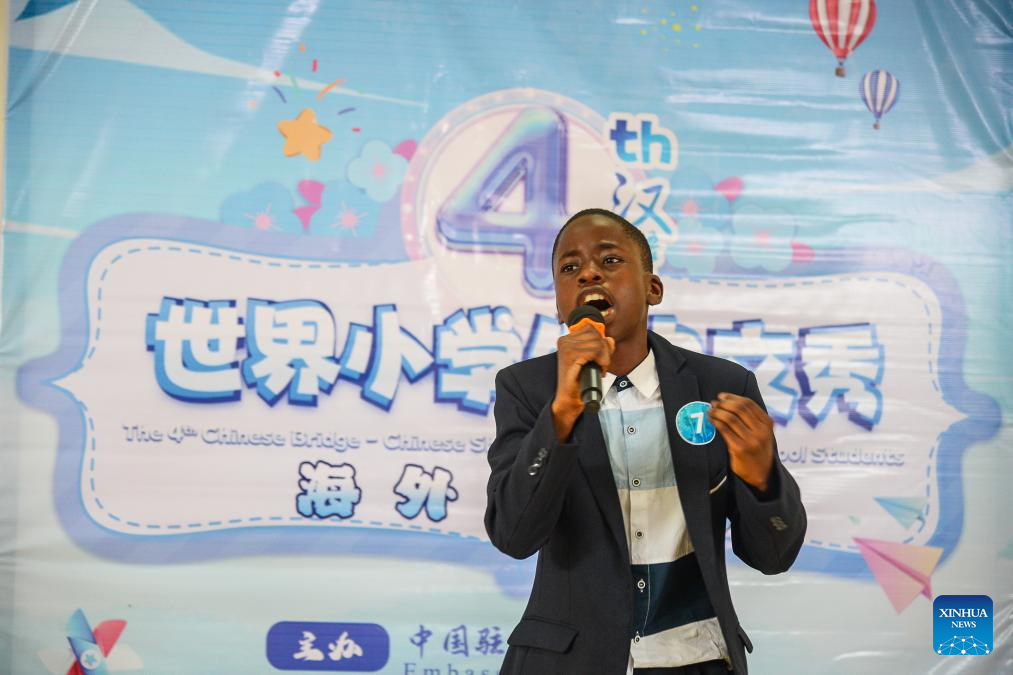 A contestant competes in the Cameroon Finals of the 4th "Chinese Bridge" Chinese Show Competition for foreign primary school students in Soa, Cameroon, May 18, 2024. The competition was held on Saturday in the Confucius Institute at University of Yaounde II in Soa, Cameroon, with 12 primary school students participated in the event. (Photo by Kepseu/Xinhua)