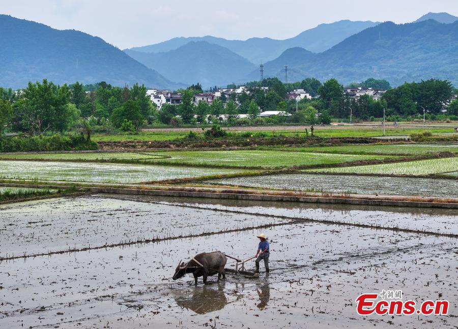 Villagers work on a rice field ahead of the traditional Chinese solar term Xiaoman (grain buds) which falls on May 20 this year. (Photo: China News Service/Shi Yalei)