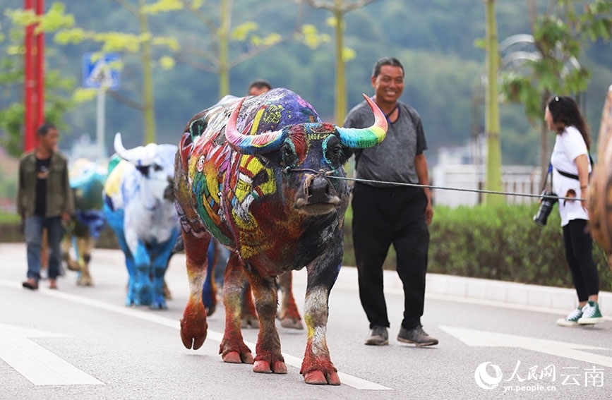 Buffaloes present paintings on their bodies. (People's Daily Online/Hu Zunhui)