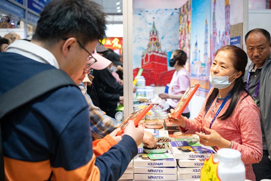 Visitors look at Russian chocolates during the eighth China-Russia Expo in Harbin, northeast China's Heilongjiang Province, May 20, 2024. (Xinhua/Wang Song)