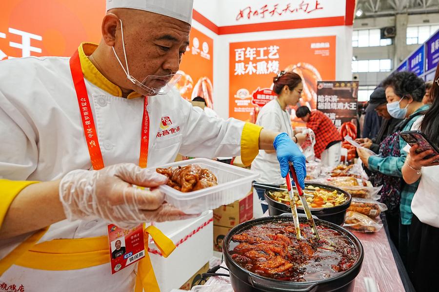 Visitors look at culinary dishes during the eighth China-Russia Expo in Harbin, northeast China's Heilongjiang Province, May 20, 2024. (Xinhua/Xie Jianfei)