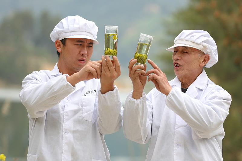 Tea artisans compare the effects of brewing using different techniques in southwest China’s Guizhou Province. (CNS/Qu Honglun)