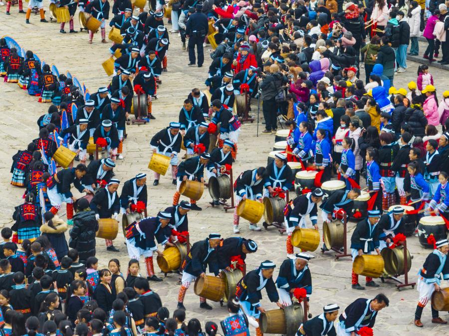 An aerial drone photo taken on Feb. 23, 2024 shows local residents beating drums to welcome guests in Nandan County, south China's Guangxi Zhuang Autonomous Region. (Photo by Liu Zheng/Xinhua)