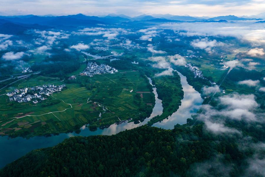 An aerial drone photo taken on April 13, 2023 shows the scenery of the Moon Bay in Wuyuan, east China's Jiangxi Province. (Xinhua)