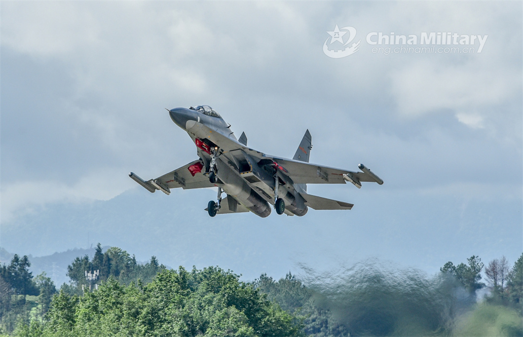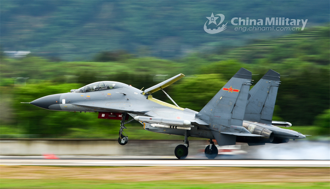 A fighter jet attached to an aviation brigade with the air force under the PLA Eastern Theater Command takes off for an air battle training exercise in early May, 2024. (eng.chinamil.com.cn/Photo by Fu Gan)
