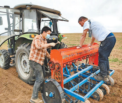Agricultural technicians repair sowing equipment in northwest China's Qinghai Province. (Photo/Ma Yajun)