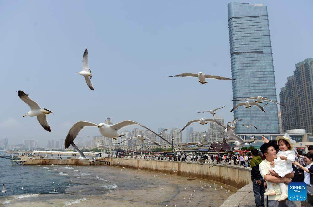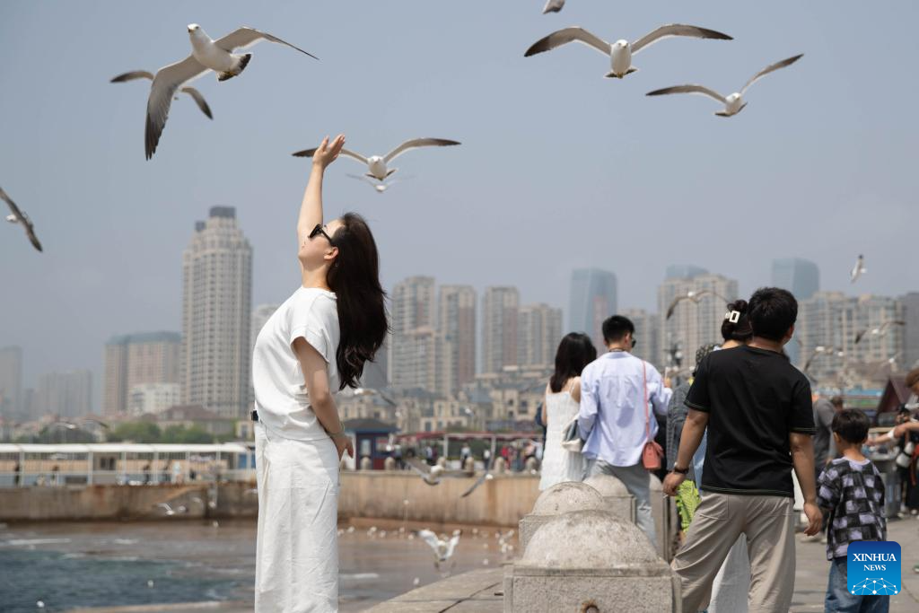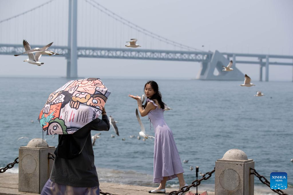 Tourists have fun at Xinghai Square in Dalian, northeast China's Liaoning Province, May 22, 2024. Various scenic spots in Dalian see surging tourists as the coastal city reaches the peak of its tourism season. The sites as zoos and aquariums even the natural places where tourists can see wild animals are among the increasingly popular destinations for the tourists. (Xinhua/Liu Yun)