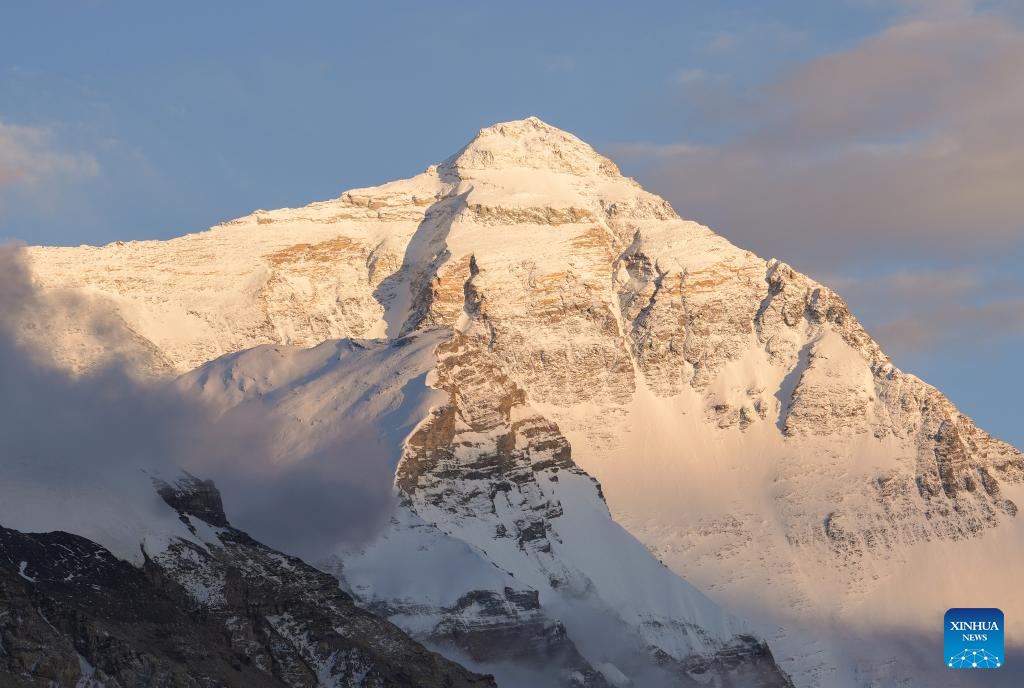 This photo taken on May 21, 2024 from the Mount Qomolangma base camp in Tingri County of Xigaze City in southwest China's Xizang Autonomous Region shows a view of Mount Qomolangma at sunset. (Xinhua/Ding Ting)