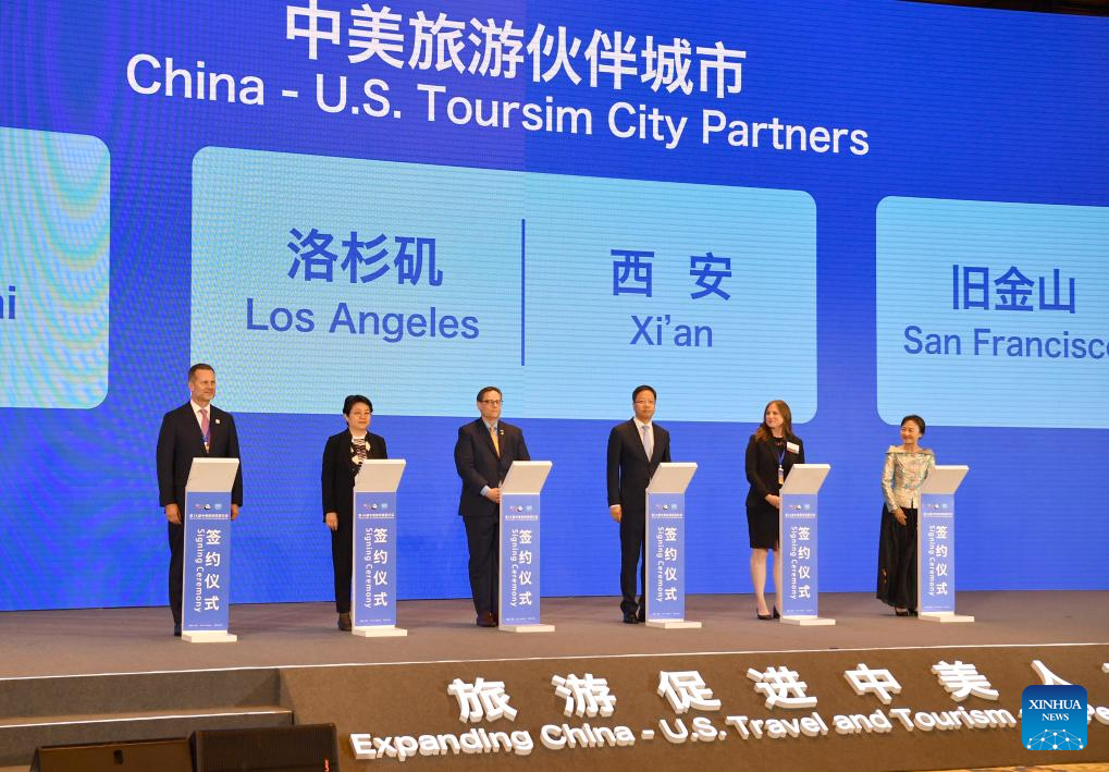 This photo taken on May 22, 2024 shows a signing ceremony of China-U.S. Tourism City Partners during the 14th China-U.S. Tourism Leadership Summit in Xi'an, northwest China's Shaanxi Province. The summit opened in Xi'an on Wednesday, with the theme of "Expanding China-U.S. Travel and Tourism and People-to-people Exchanges." It is co-hosted by the Ministry of Culture and Tourism of China, the People's Government of Shaanxi Province, the U.S. Department of Commerce, and Brand USA. (Xinhua/Shao Rui)