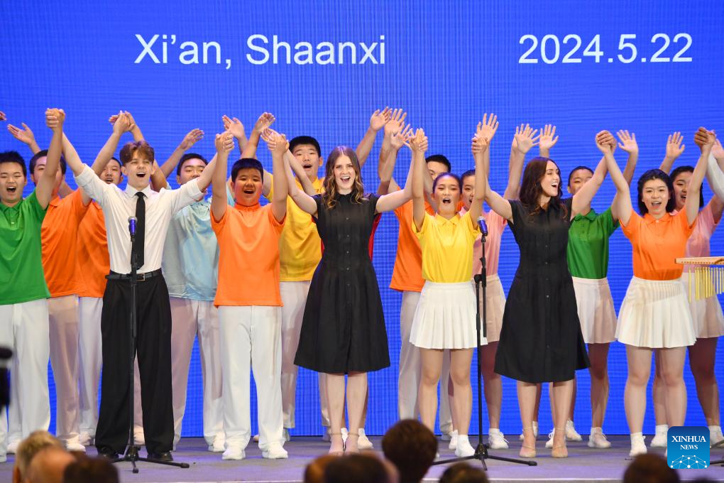 Chinese and Amercian students perform at the opening ceremony of the 14th China-U.S. Tourism Leadership Summit in Xi'an, northwest China's Shaanxi Province, May 22, 2024. The summit opened in Xi'an on Wednesday, with the theme of "Expanding China-U.S. Travel and Tourism and People-to-people Exchanges." It is co-hosted by the Ministry of Culture and Tourism of China, the People's Government of Shaanxi Province, the U.S. Department of Commerce, and Brand USA. (Xinhua/Shao Rui)