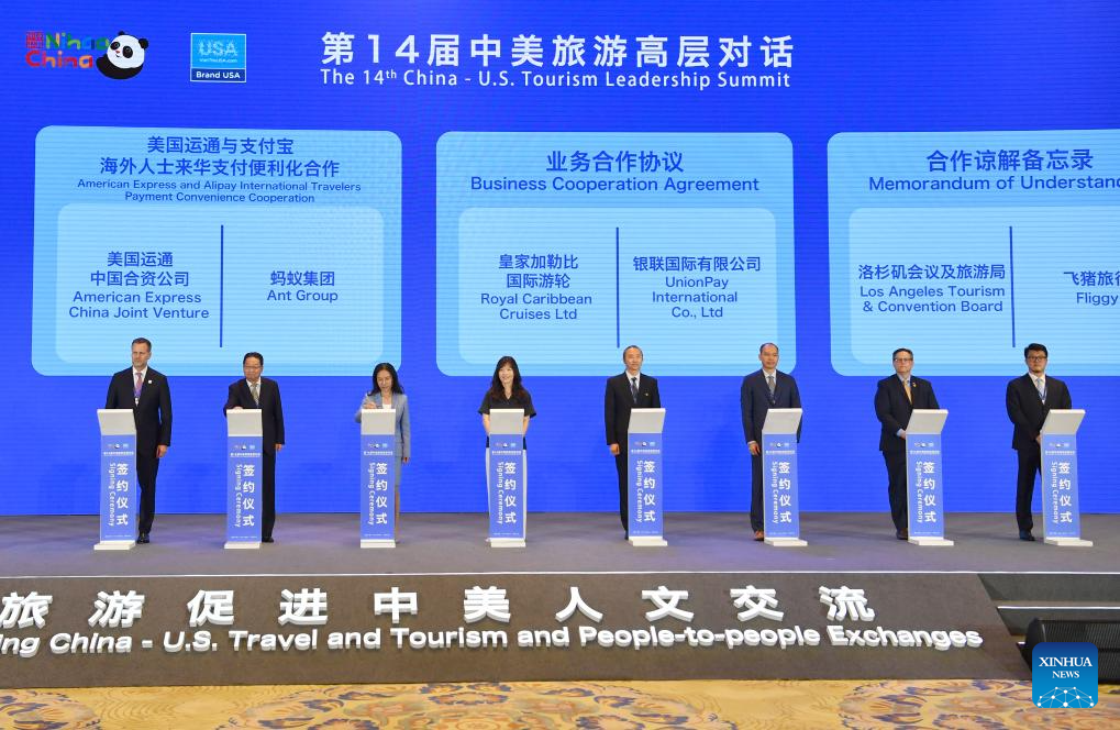 This photo taken on May 22, 2024 shows a signing ceremony during the 14th China-U.S. Tourism Leadership Summit in Xi'an, northwest China's Shaanxi Province. The summit opened in Xi'an on Wednesday, with the theme of "Expanding China-U.S. Travel and Tourism and People-to-people Exchanges." It is co-hosted by the Ministry of Culture and Tourism of China, the People's Government of Shaanxi Province, the U.S. Department of Commerce, and Brand USA. (Xinhua/Shao Rui)