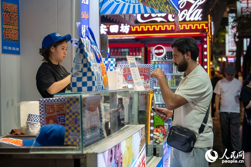 A foreign visitor buys delicacies at the Muslim Quarter, a famous attraction in Xi'an, capital of northwest China's Shaanxi Province. (People's Daily Online/Weng Qiyu)