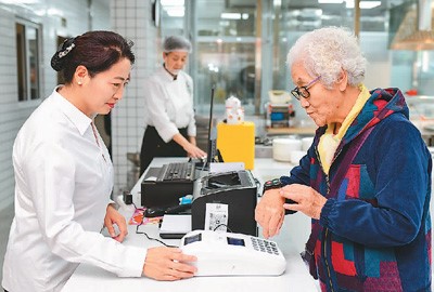 An older woman uses a smart device to pay for a meal at a community canteen in Kangbashi district, Ordos city, north China's Inner Mongolia Autonomous Region. (Photo/Wang Zheng)