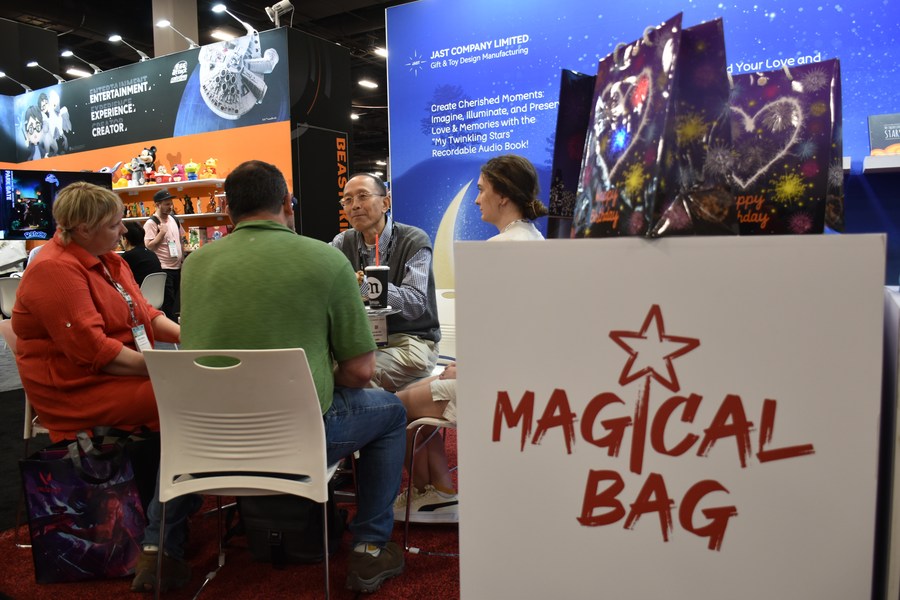 People visit the exhibition area of Chinese company JAST Company Limited at Licensing Expo 2024 in Las Vegas, the United States, on May 22, 2024. (Photo by Zeng Hui/Xinhua)