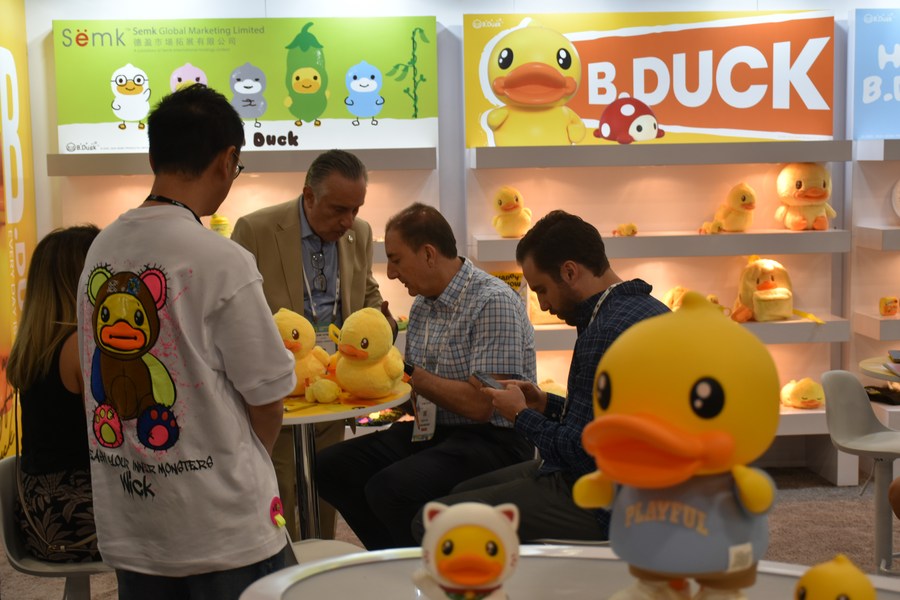People visit the exhibition area of Chinese brand B. Duck at Licensing Expo 2024 in Las Vegas, the United States, on May 22, 2024. (Photo by Zeng Hui/Xinhua)