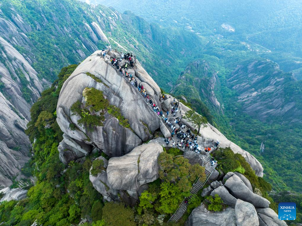 An aerial drone photo taken on May 20, 2024 shows tourists visiting the Tiandu peak in Huangshan Mountain scenic area in Huangshan City, east China's Anhui Province. The Tiandu peak, one of the most popular sites in Huangshan Mountain scenic area, has recently reopened after a rotational closure period which allows nature to rest and self-repair. (Photo by Shi Yalei/Xinhua)