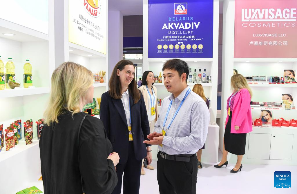 People visit a booth of Belarus, the guest country of honor, during the Sixth Western China International Fair for Investment and Trade in Chongqing International Expo Center in southwest China's Chongqing Municipality, May 23, 2024. With the theme of "New Western China, New Manufacturing, New Services", the fair is held from May 23 to 26 in Chongqing. (Xinhua/Wang Quanchao)