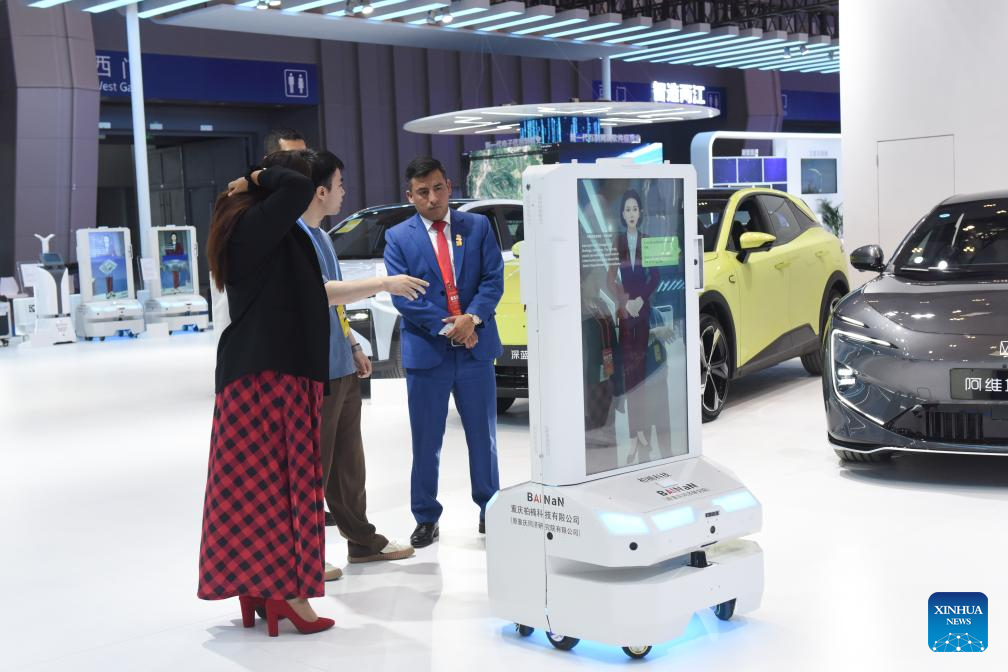 People listen to an introduction of a robot during the Sixth Western China International Fair for Investment and Trade in Chongqing International Expo Center in southwest China's Chongqing Municipality, May 23, 2024. With the theme of "New Western China, New Manufacturing, New Services", the fair is held from May 23 to 26 in Chongqing. (Xinhua/Zhang Ziyu)