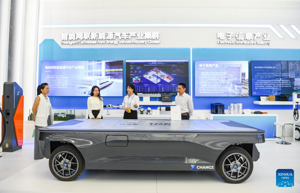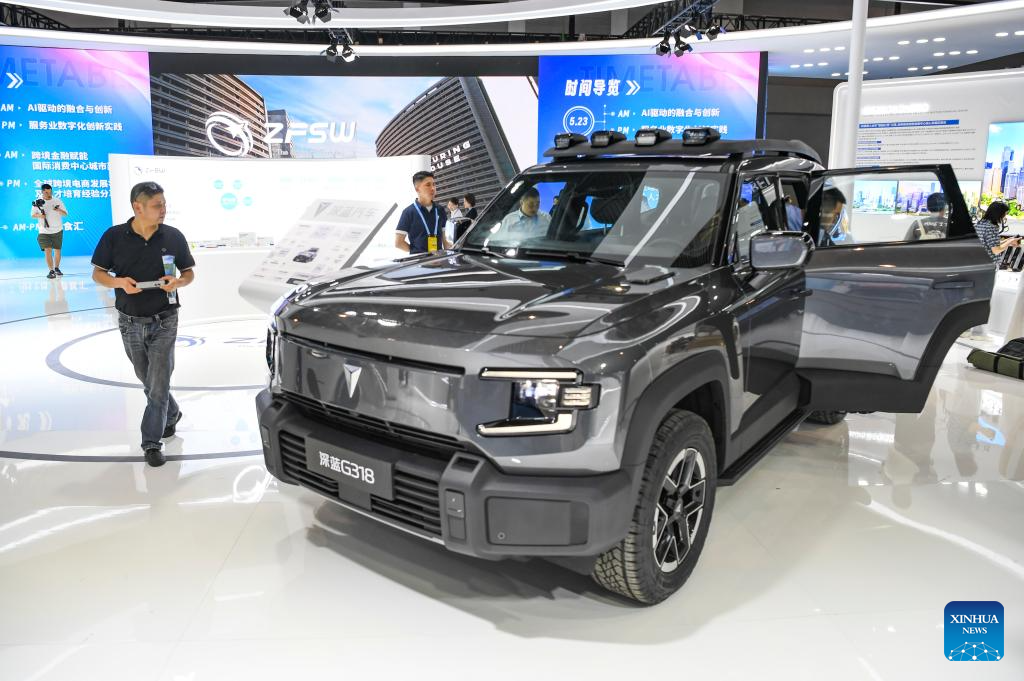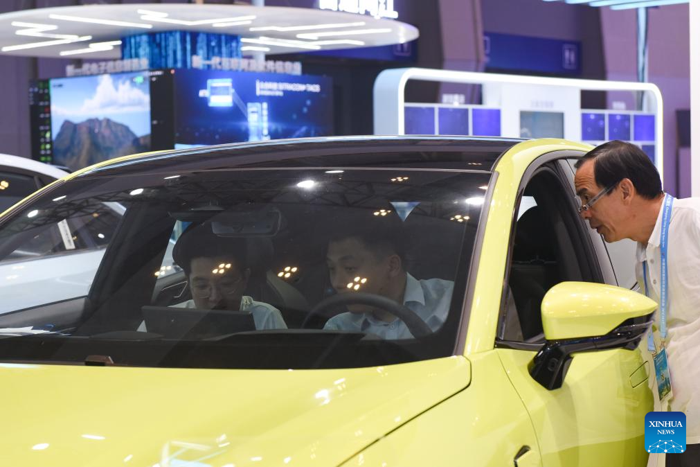 People look at a vehicle during the Sixth Western China International Fair for Investment and Trade in Chongqing International Expo Center in southwest China's Chongqing Municipality, May 23, 2024. With the theme of "New Western China, New Manufacturing, New Services", the fair is held from May 23 to 26 in Chongqing. (Xinhua/Zhang Ziyu)