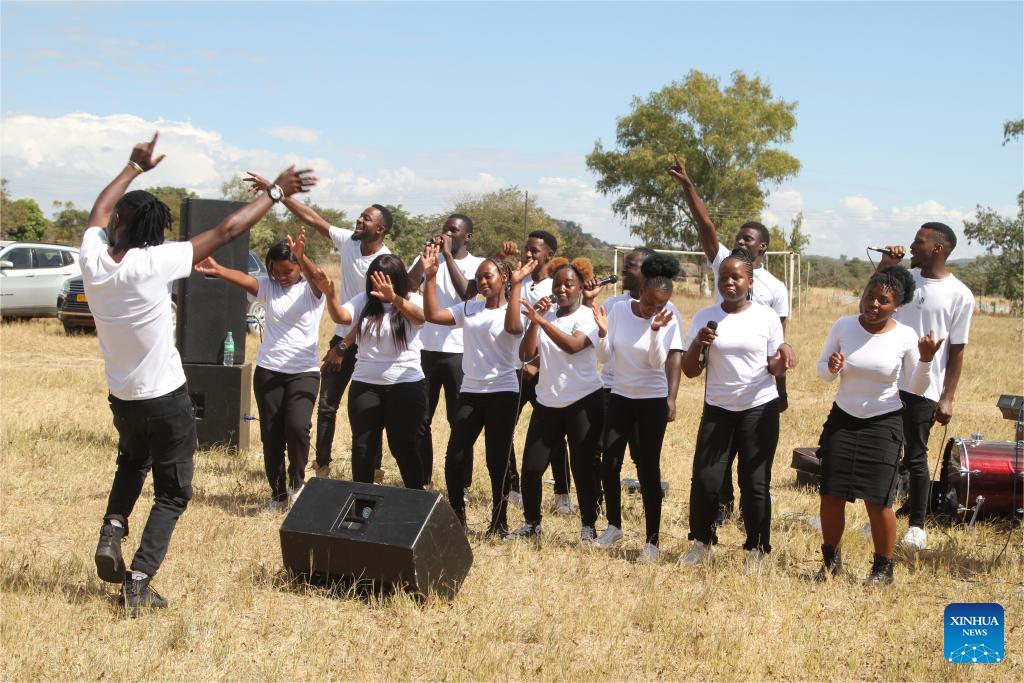 The Confucius Institute choir at the University of Zimbabwe sings a Chinese song during a China-Zimbabwe cultural exchange event in Goromonzi, a rural community in the East Mashonaland Province, Zimbabwe, on May 23, 2024. Chinese firm Prospect Lithium Zimbabwe (PLZ), together with the Confucius Institute at the University of Zimbabwe, held a cultural exchange event Thursday to mark Africa Day, which is commemorated annually on May 25. (Xinhua/Tafara Mugwara)
