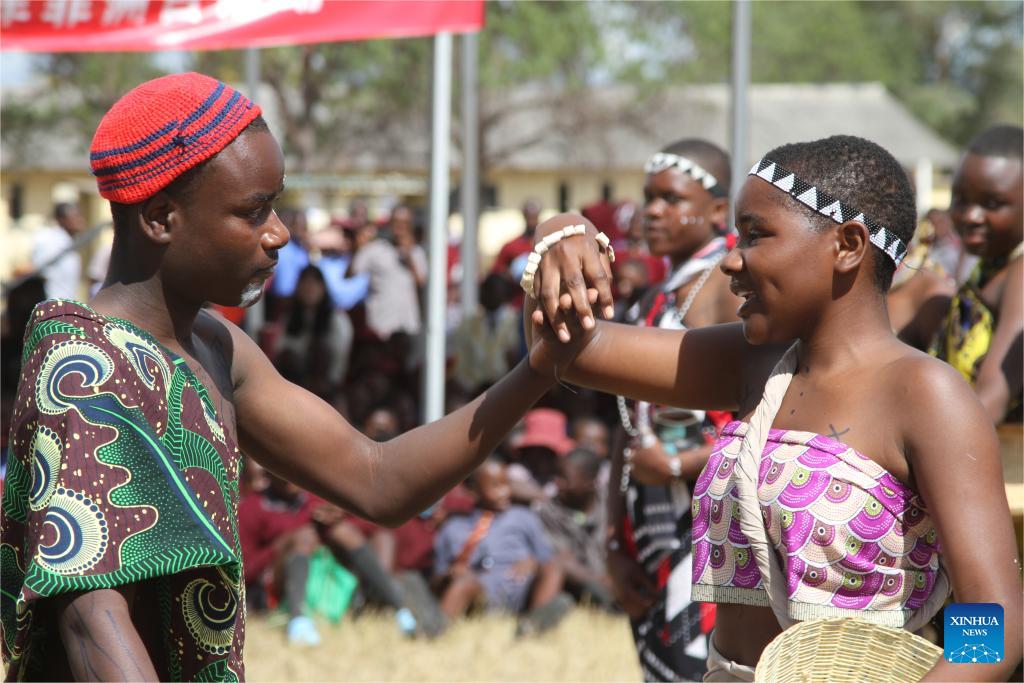 People perform a Chinese dance during a China-Zimbabwe cultural exchange event in Goromonzi, a rural community in the East Mashonaland Province, Zimbabwe, on May 23, 2024. Chinese firm Prospect Lithium Zimbabwe (PLZ), together with the Confucius Institute at the University of Zimbabwe, held a cultural exchange event Thursday to mark Africa Day, which is commemorated annually on May 25. (Xinhua/Tafara Mugwara)