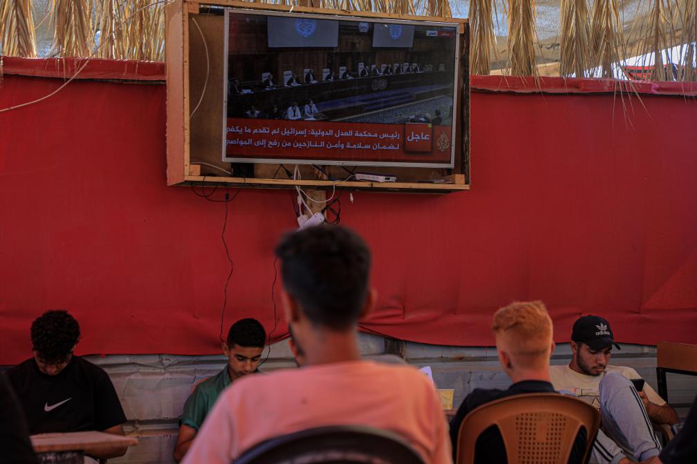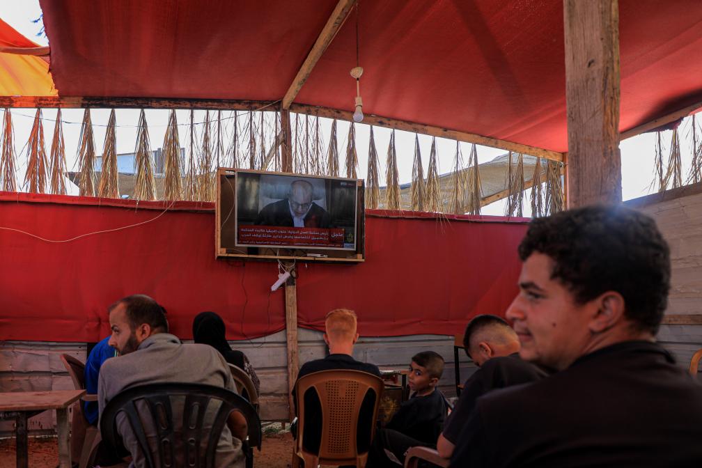 Palestinians watch a session of the International Court of Justice (ICJ) at a cafe in the southern Gaza Strip city of Khan Younis, on May 24, 2024. The Palestinian presidency on Friday welcomed the ruling of the International Court of Justice (ICJ) ordering Israel to stop its military offensive in Rafah with immediate effect. (Photo by Rizek Abdeljawad/Xinhua)