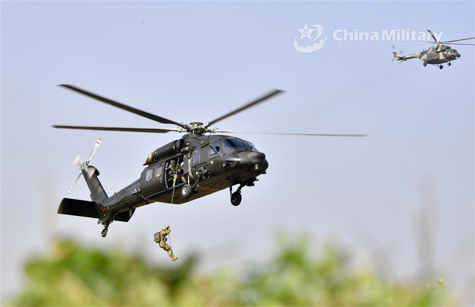 A Soldier assigned to a brigade under the PLA 73rd Group Army fast-ropes from a helicopter during a joint assault training exercise on May 11, 2024. (eng.chinamil.com.cn/Photo by Shi Zhipeng)