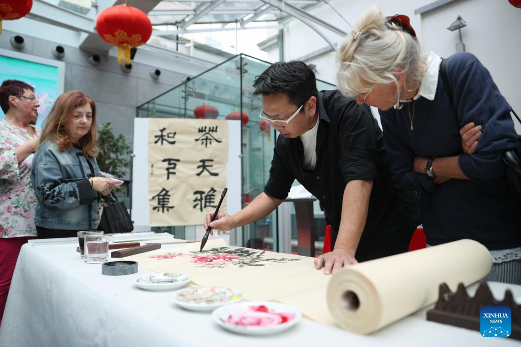 An artist creates a Chinese painting during the "Yaji Cultural Salon" in Brussels, Belgium, on May 24, 2024. The "Yaji Cultural Salon," or Tea for Harmony, held here Friday showcased the elegance and flavor of Yunnan tea, featuring an exhibition of its national intangible cultural heritage. (Xinhua/Zhao Dingzhe)