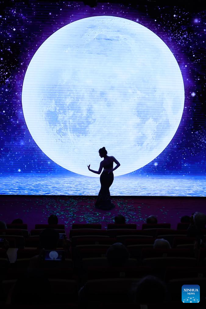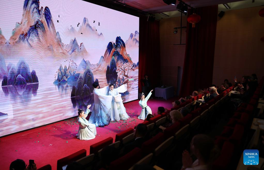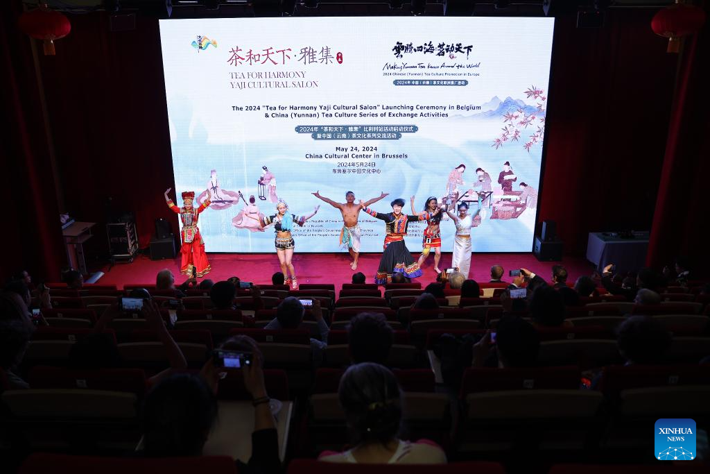 Dancers perform during the "Yaji Cultural Salon" in Brussels, Belgium, on May 24, 2024. The "Yaji Cultural Salon," or Tea for Harmony, held here Friday showcased the elegance and flavor of Yunnan tea, featuring an exhibition of its national intangible cultural heritage. (Xinhua/Zhao Dingzhe)