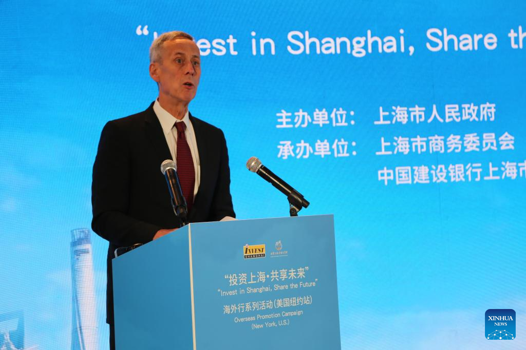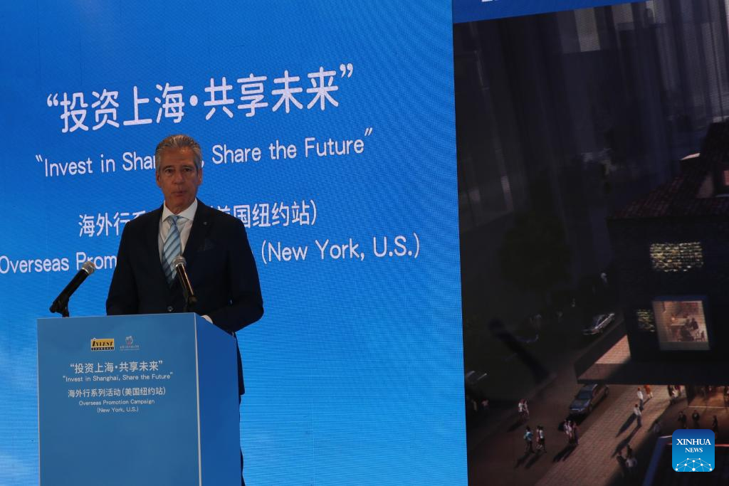 Guests attend a promotion event in New York, the United States, on May 23, 2024. China's business hub Shanghai held a promotion event here Thursday, which drew great attention and interest from investors in the United States.