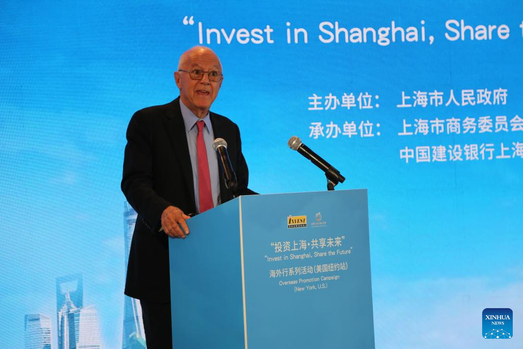 Stephen Orlins, president of the National Committee of U.S.-China Relations, delivers a speech at a promotion event in New York, the United States, on May 23, 2024. China's business hub Shanghai held a promotional event here Thursday, which drew great attention and interest from investors in the United States.