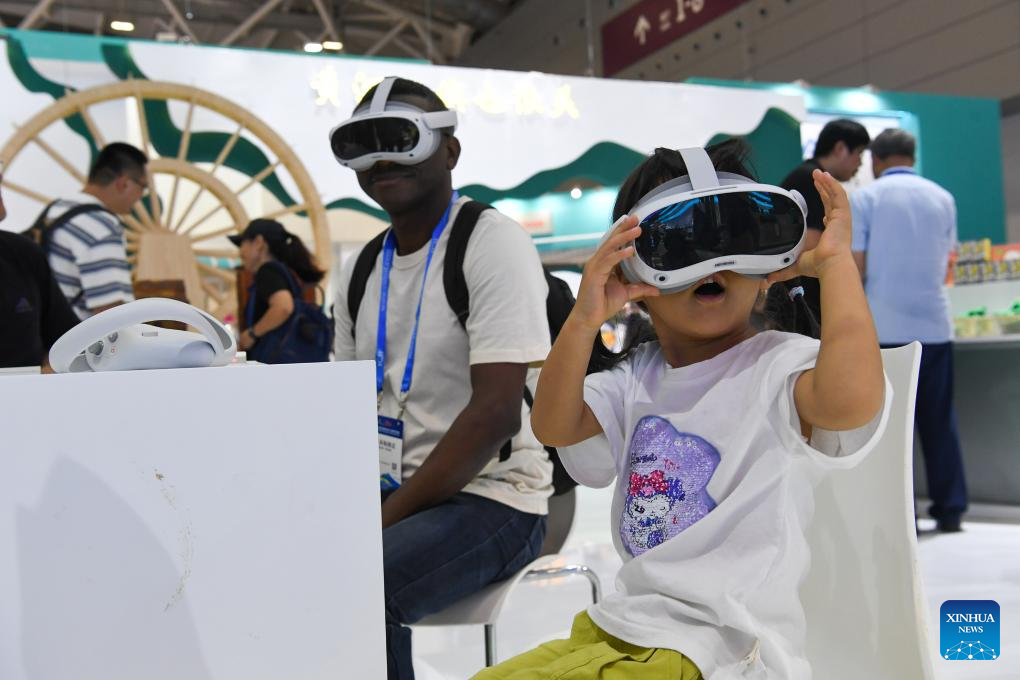 People try VR devices during the 20th China (Shenzhen) International Cultural Industries Fair (ICIF) in Shenzhen, south China's Guangdong Province, May 23, 2024. The 20th ICIF opened on Thursday in the southern Chinese metropolis of Shenzhen. The fair will showcase new business forms and new applications through the combination of multimedia such as AI and AR. (Xinhua/Liang Xu)