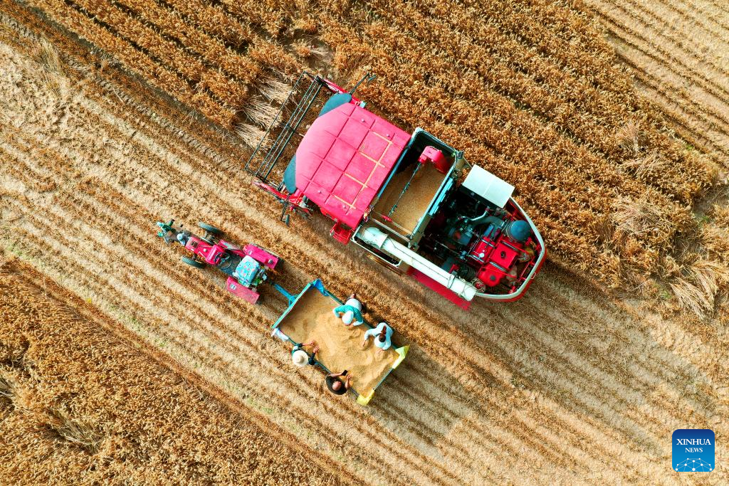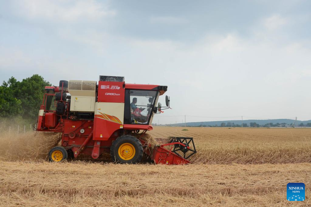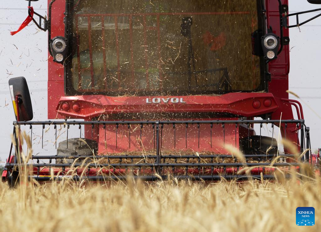 Farmers harvest wheat in the fields in Zhanglou Township in Runan County, Zhumadian City of central China's Henan Province, May 24, 2024. (Photo by Zhang Meng/Xinhua)