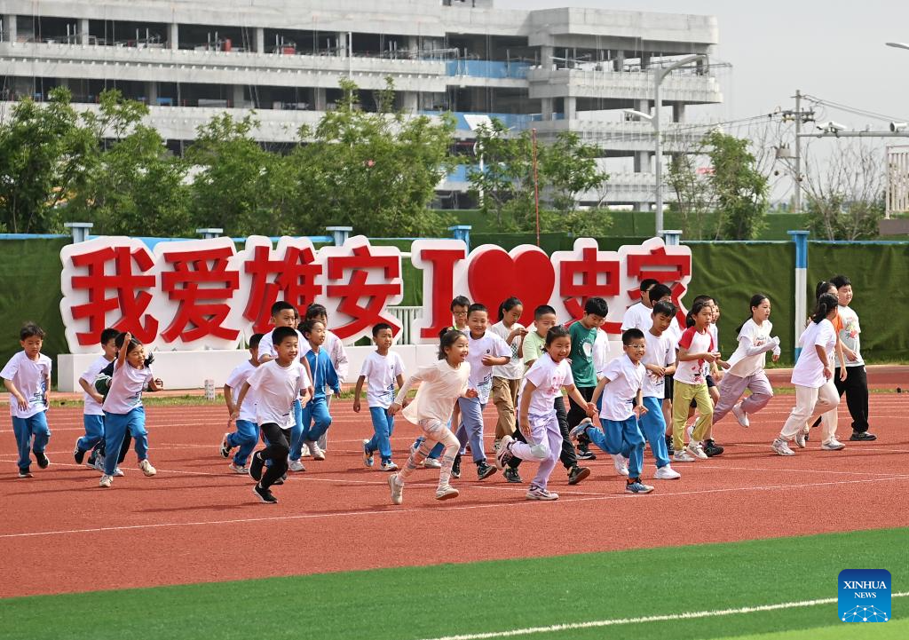 Students participate in outdoor activities at the Xiong'an campus of the Shijiahutong Elementary School in Xiong'an New Area, north China's Hebei Province, May 21, 2024. In recent years, Xiong'an New Area has continuously promoted the high-quality education construction. The area has introduced innovative education development system, constructed high-standard education facilities, and introduced professional education resources. Currently, the area has 717 schools, with 235,000 students and 20,000 teachers. (Xinhua/Mu Yu)