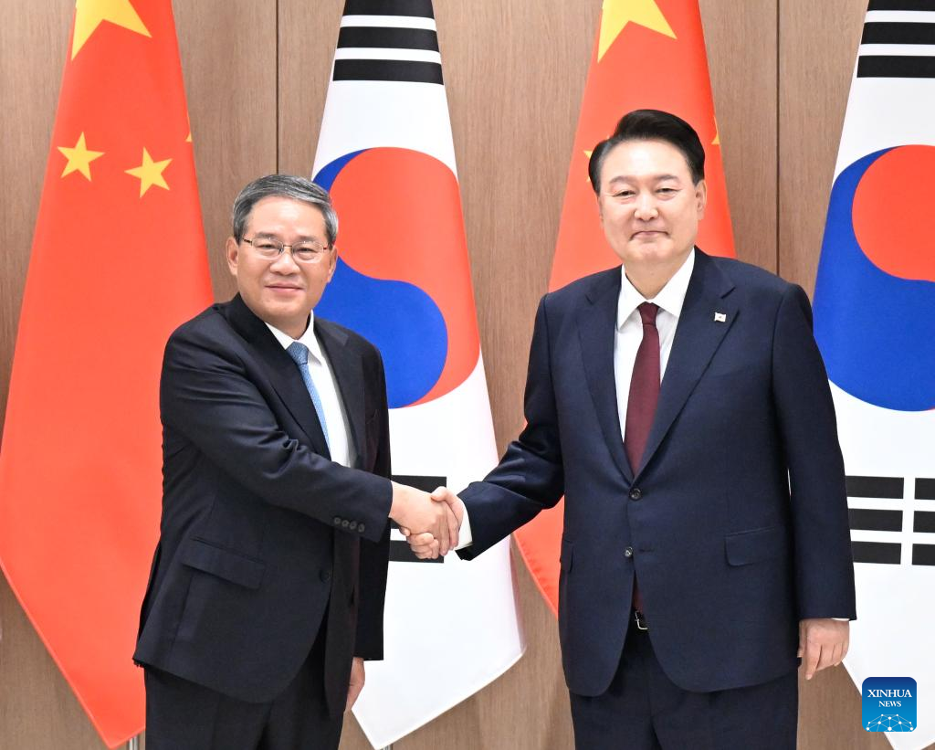Chinese Premier Li Qiang meets with South Korean President Yoon Suk-yeol in Seoul, South Korea, May 26, 2024. Li arrived here Sunday to attend the ninth Trilateral Summit Meeting among China, Japan and South Korea from Sunday to Monday. (Xinhua/Liu Bin)