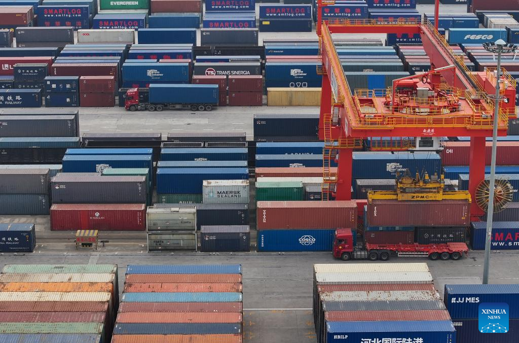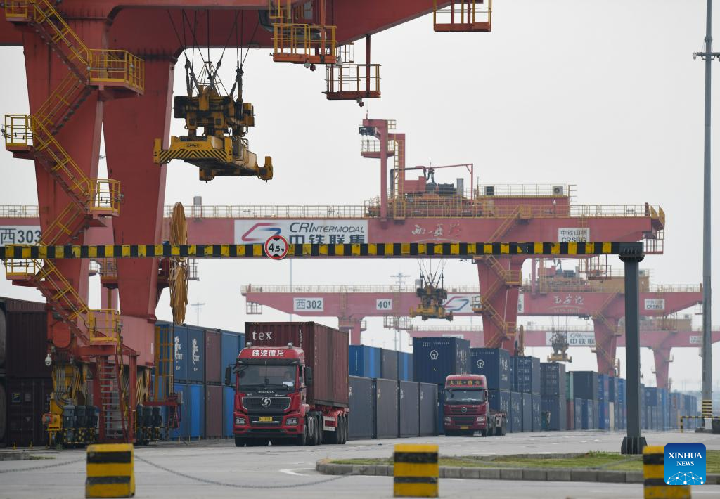 Trucks transport containers at Xi'an international port station in Xi'an, the capital city of northwest China's Shaanxi Province, May 25, 2024. (Xinhua/Zhang Bowen)