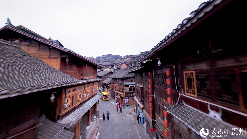Photo shows an array of stilted buildings in Xijiang Qianhu Miao Village. (People’s Daily Online/Tu Min)