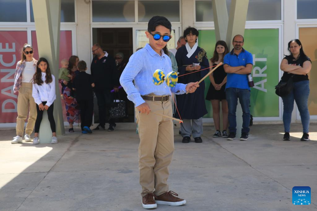 A secondary school student performs traditional Chinese diabolo (kongzhu) in the "Chinese Bridge" competition in Hamrun, Malta, May 25, 2024. (Xinhua/Chen Wenxian)
